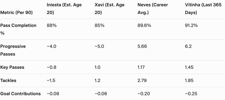 Neves and Vitinha aren't yet Xavi and Iniesta—they lack the trophy hauls (50+ combined for the Spaniards) and those spine-tingling finals. But at the same career checkpoint, they're lapping the field: more minutes, more menace, more magic. In a post-tiki-taka world of pressing and transitions, they've adapted the blueprint—91% passes, 6+ progressives, and bite up front.