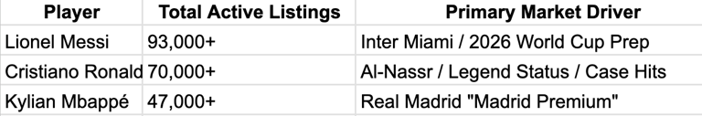 The Takeaway: Even in 2026, the "Old Guard" (Messi/Ronaldo) still accounts for more total transactions than almost the entire rookie class combined. Messi’s Inter Miami cards and Ronaldo’s high-end Panini Kaboom! inserts remain the most-watched items on the platform.